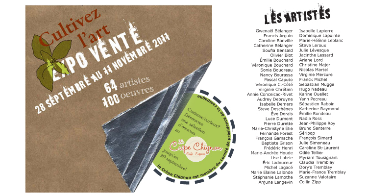 Gwenaël Bélanger, membre du comité de présidence de Cultivez l’art ~ Francis Arguin ~Caroline Banville ~ Soufia Bensaïd ~ Catherine Bélanger ~ Olivier Blot ~ Émilie Bouchard ~ Véronique Bouchard ~ Sonia Boudreau ~ Nancy Bourassa ~ Pascal Caputo ~ Véronique Chagnon-Côté ~ Virginie Chrétien ~ Annie Conceicao-Rivet ~ Audrey Debruyne ~ Steve Deschênes ~ Ève Dorais ~ Luce Dumont ~ Pierre Durette ~ Marie-Christyne Élie ~ Fernande Forest ~ Baptiste Grison ~ Frédéric Henri ~ Marie-Andrée Houde ~ François Gamache ~ Lise Labrie ~ Michel Lagacé ~ Anjuna Langevin ~ Marie-Élaine Lalonde ~ Stéphanie Lamothe ~ Isabelle Lapierre ~ Marie-Hélène Leblanc ~ Steve Leroux ~ Jacinthe Lessard ~ Julie Lévesque ~ Ariane Lord ~ Christine Major ~ Nicolas Martel ~ Franck Michel ~ Christian Messier ~ Virginie Mercure ~ Sebastian Mügge ~ Hugo Nadeau ~ Karine Ouellet ~ Yann Pocreau ~ Katherine Raymond ~ Émilie Rondeau ~ Nadia Ross ~ Séripop ~ Julie Simoneau ~ Myriam Tousignant ~ Nadia Ross ~ Jean-Philippe Roy ~ Bruno Santerre ~ Caroline St-Laurent ~ François Simard ~ Claudia Tremblay ~ Dory’s Tremblay ~ Odile Tellier ~ Marie-France Tremblay ~ Suzanne Valotaire ~ Collin Zipp