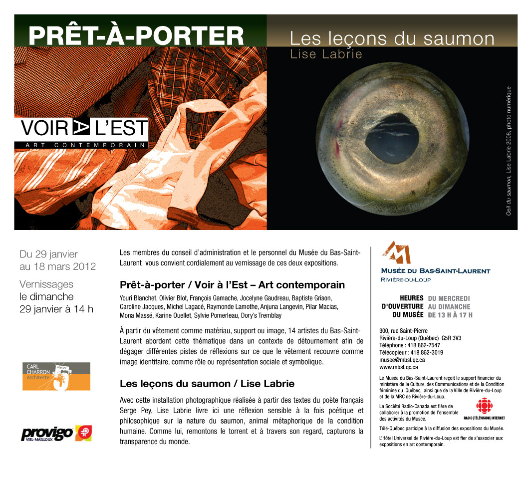 Prêt-à-Porter Du 29 janvier au 18 mars 2012. Liens : Infodimanche.com Journal Le Mouton Noir Musée du Bas-Saint-Laurent Journal La Rumeur du Loup Le Saint-Laurent Portage Partager : Partager sur Facebook(ouvre dans une nouvelle fenêtre) Facebook Partager sur X(ouvre dans une nouvelle fenêtre) X J’aime chargement…